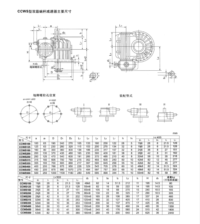 CCW系列双极蜗轮蜗杆减速机按照一级减速机的安装方式分为:蜗杆下置型(CCWU)、蜗杆侧置型(CCWS)、蜗杆上置型(CCWO)。